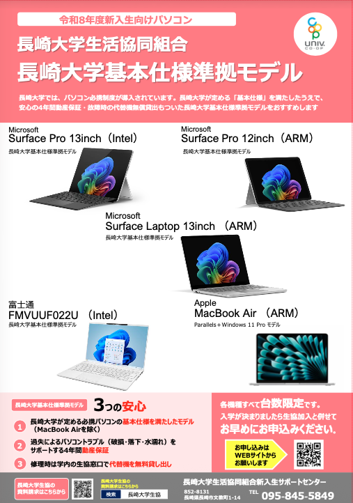 ※ Apple Mac Book Airの購入には、注意事項がございます。Q&Aのページをご確認ください。 https://www.cc.nagasaki-u.ac.jp/pcsetup/hikkei_faq.html